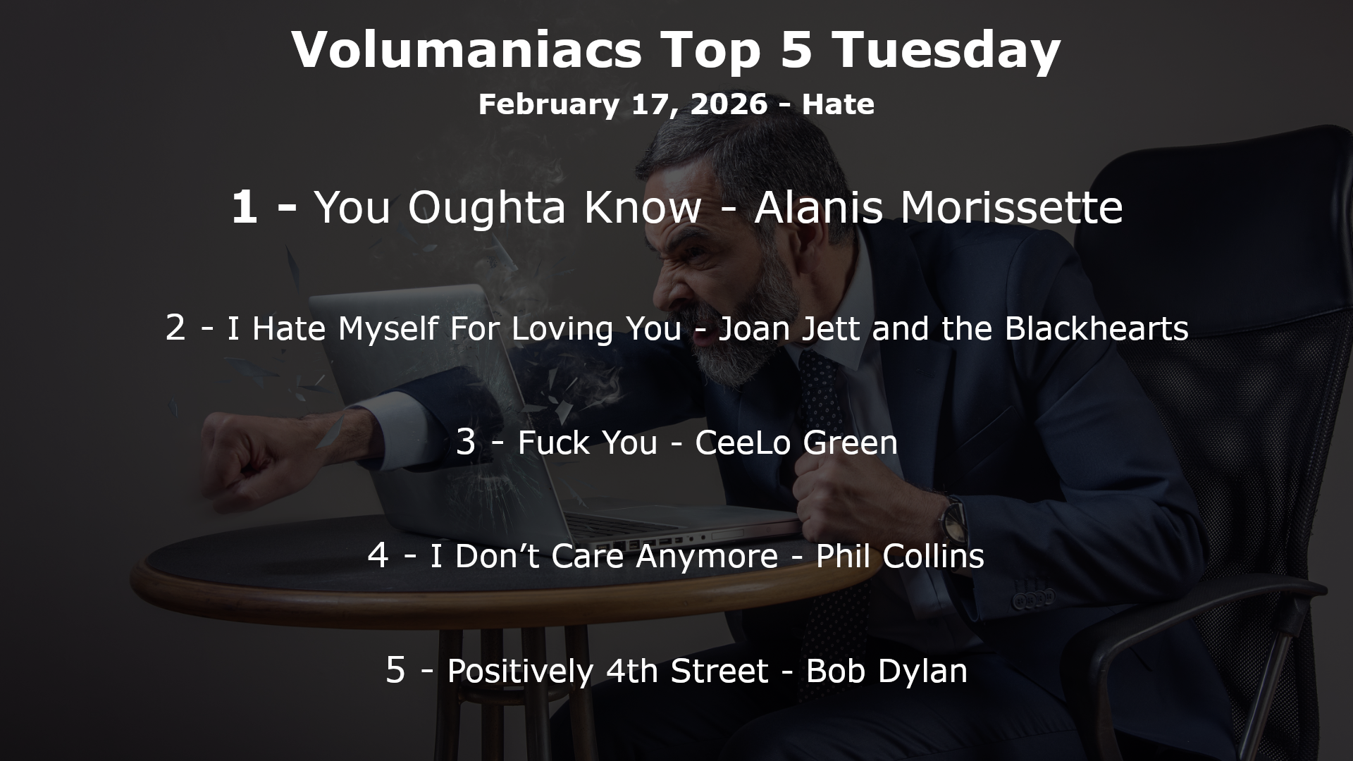 Top5 Date February 17, 2026 Top5ResultsImage Body Top 5 Tuesday: we missed “love” songs for Valentine’s Day. This week we’re going with the opposite, Top 5 songs about hating.