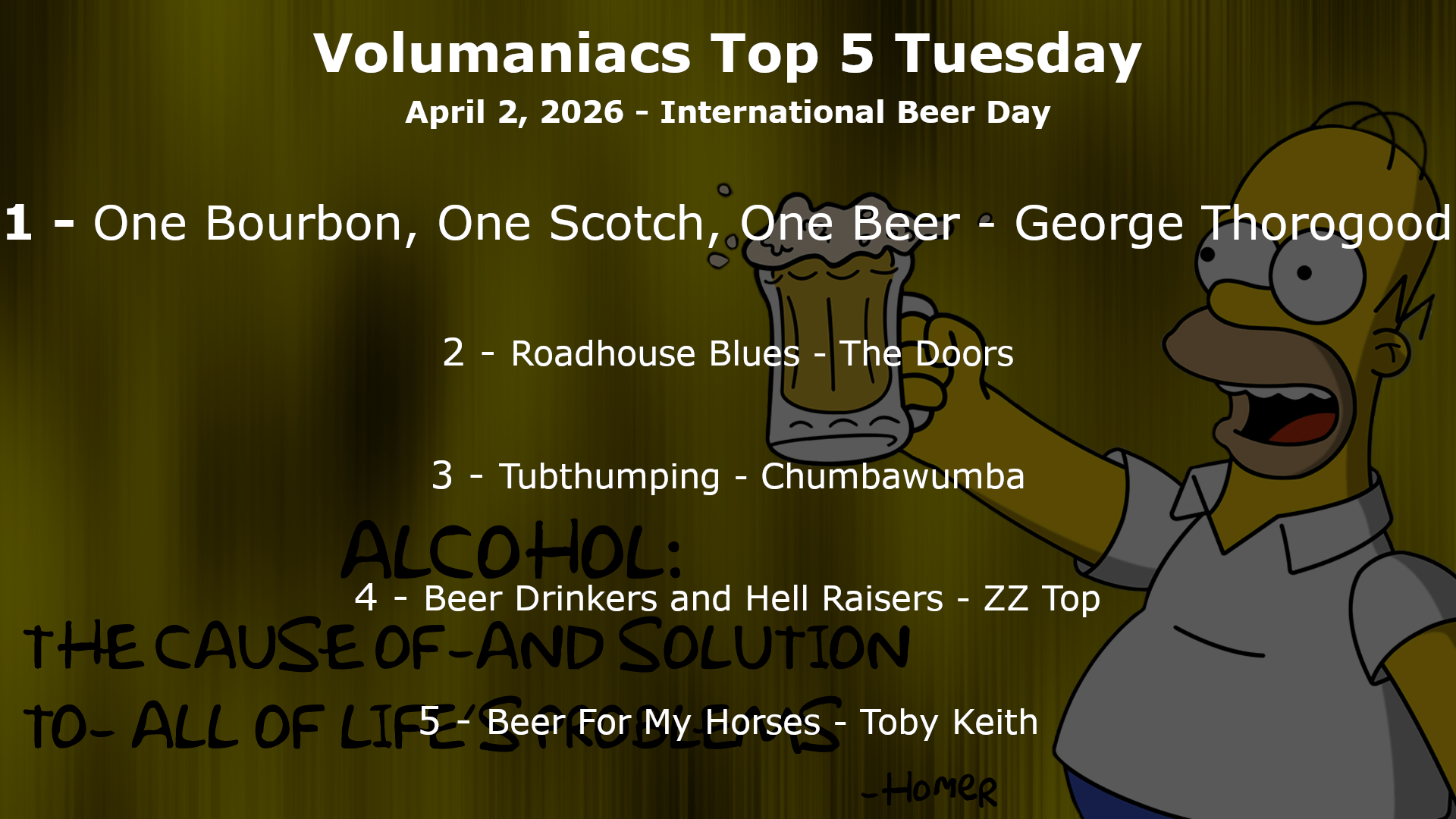 Top5 Date April 7, 2026 Top5ResultsImage Body Top 5 Tuesday: Happy New Beerβs Eve! Tuesday is National Beer Day! This week is Top 5 songs about Beer