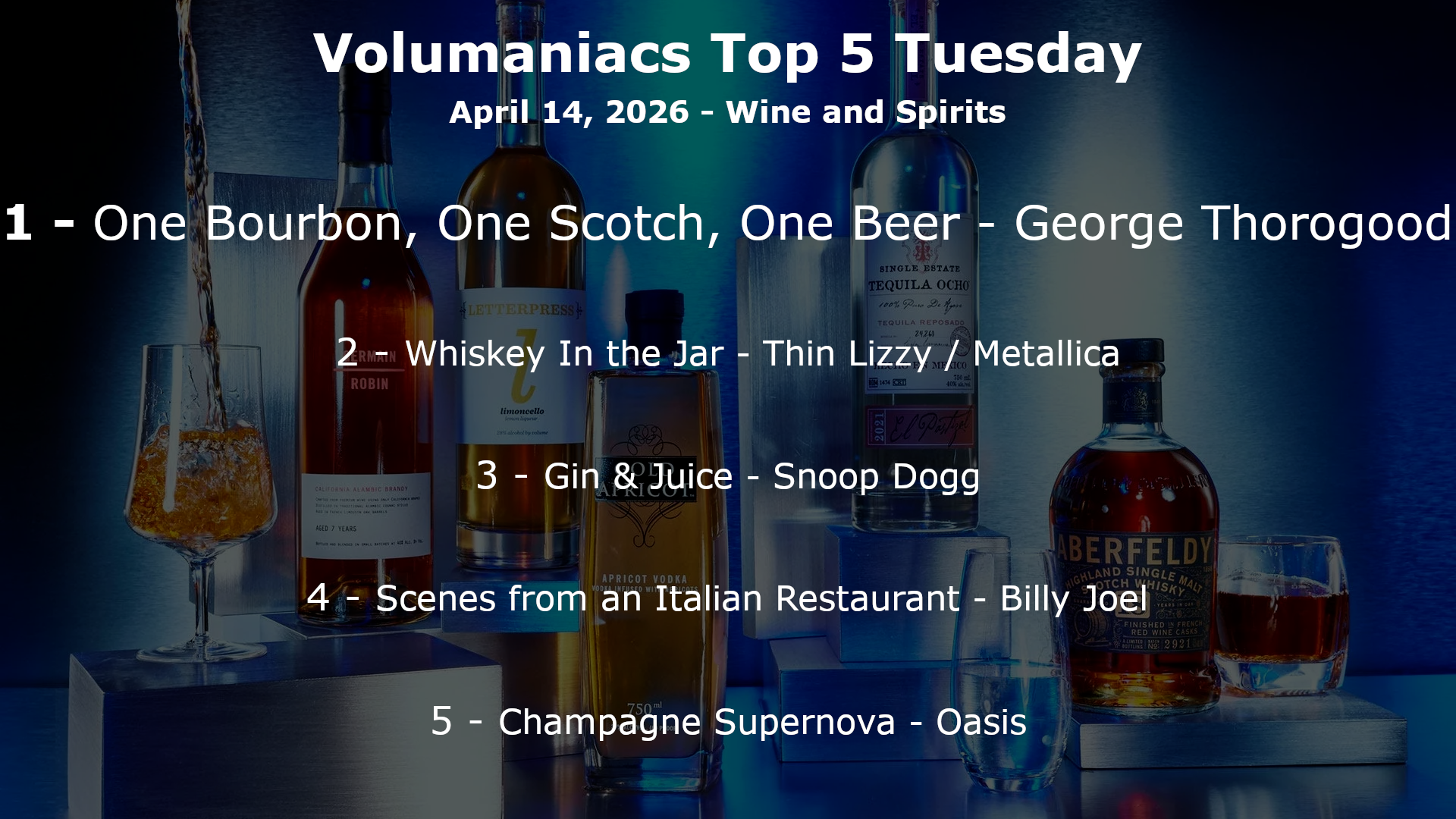 Top5 Date April 14, 2026 Top5ResultsImage Body Top 5 Tuesday: After last week, we still feel the need to drink heavily. This week is Top 5 songs about all other alcohol (not beer)