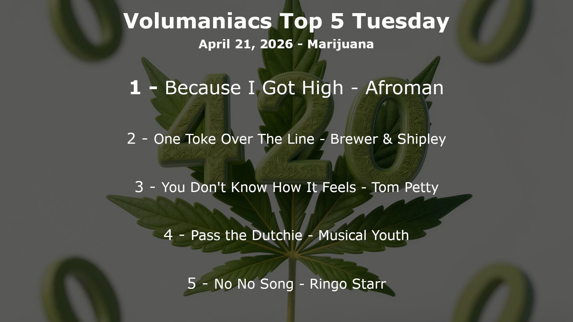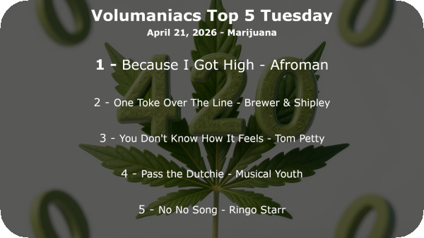 Top5 Date April 21, 2026 Top5ResultsImage Body Top 5 Tuesday: Might as well complete the trifecta of vices and embrace the day. This week is Top 5 songs about Marijuana.