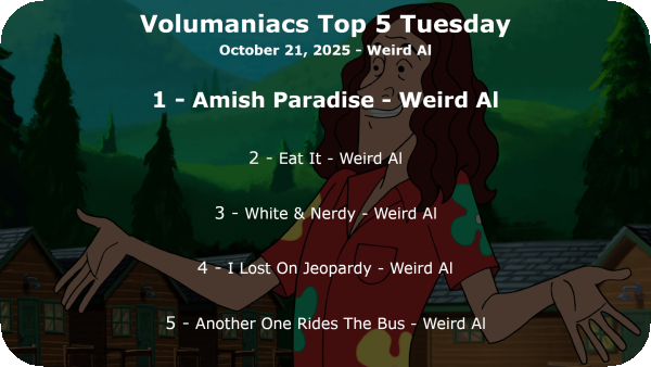Top5 Date October 21, 2025 Top5ResultsImage Body Weird Alβs birthday is on Thursday. Chris had the idea a while ago to do the Top 5 songs that Al made a parody of. Instead weβre doing that and the parody, along with any Weird Al originals.
