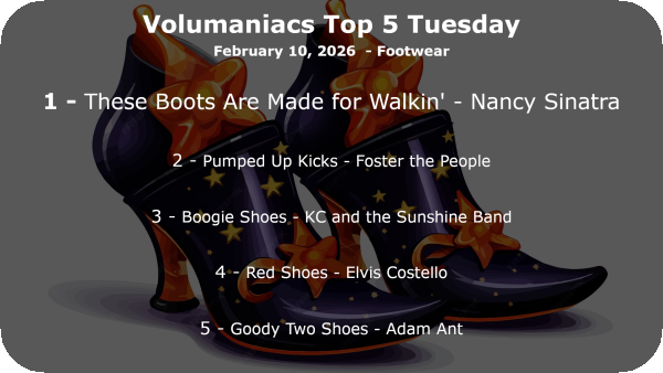 Top5 Date February 10, 2026 Top5ResultsImage Body Top 5 Tuesday: Iβm not saying who, but based on the enthusiasm, I think someone in our group may have a foot fetish. This week weβre going with Top 5 songs with footwear in the title.